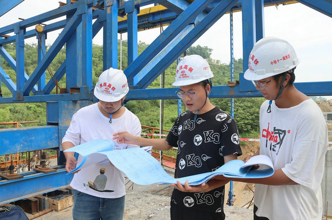 黨支部委員、總工程師朱君(左2)在樓子溝特大橋現(xiàn)場解決有關施工技術問題