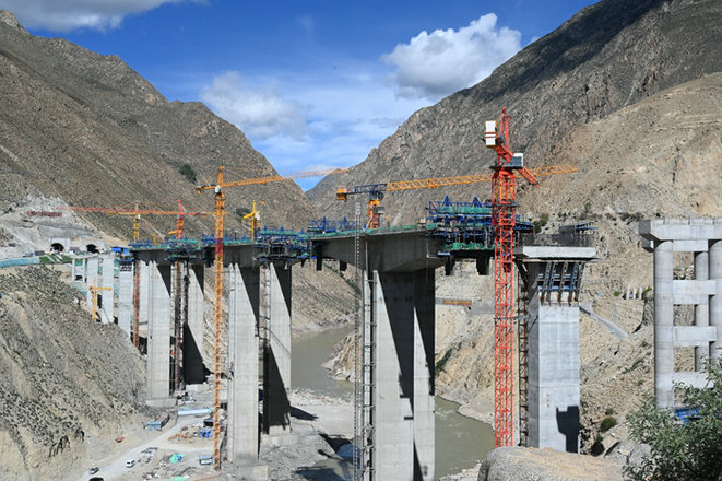 據(jù)悉,雅魯藏布江大橋連續(xù)剛構(gòu)箱梁左右幅合計800米,截止目前,已完成500米連續(xù)剛構(gòu),剩余300米預計9月初完成澆筑任務。