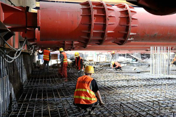 9月18日晚上9時(shí)許,我在汽車公園站,目睹施工現(xiàn)場(chǎng)人來(lái)人往,機(jī)聲轟鳴,鋼筋場(chǎng)的員工有的在下料,有的在加工綁扎鋼筋籠的開口套,吊車在倒運(yùn)材料、塔吊在為基坑里面的員工吊裝材料,基坑里面的員工在綁扎鋼筋籠、立模板,整個(gè)施工現(xiàn)場(chǎng)環(huán)環(huán)相扣、緊張有序、忙而不亂。據(jù)來(lái)自江西的王師傅介紹,他平均一天能夠加工開口套1500多個(gè)。