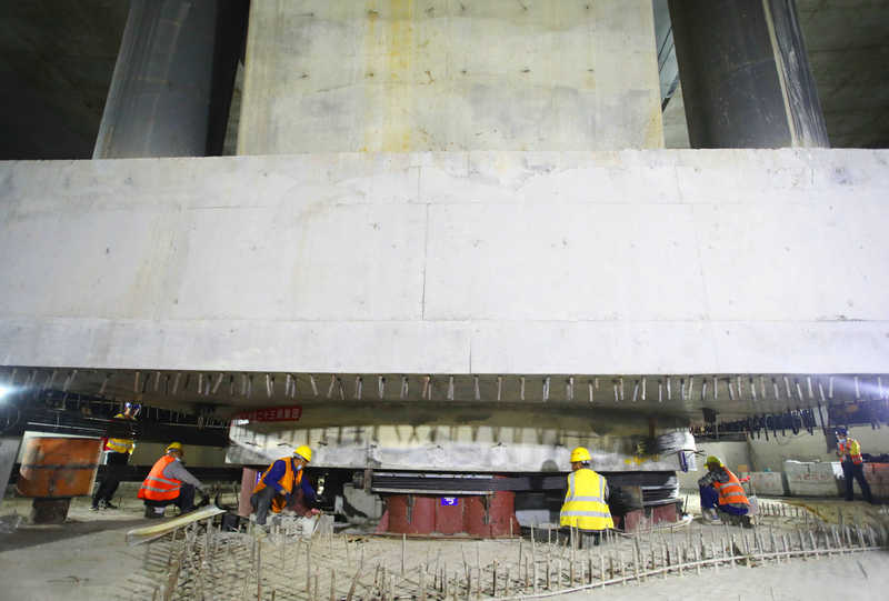 該轉(zhuǎn)體梁結構由下承臺、球鉸、上轉(zhuǎn)盤和轉(zhuǎn)動牽引系統(tǒng)組成。為確保橋梁完成高精度轉(zhuǎn)體,施工單位精心組織不斷完善施工方案,對主橋結構尺寸進行了三維建模和應力分析,對大噸位轉(zhuǎn)體支座進行了特殊優(yōu)化設計。轉(zhuǎn)體過程中,克服了夜間施工條件差、高空作業(yè)安全風險高等不利因素,做到施工組織、過程卡控、責任落實等關鍵環(huán)節(jié)的無縫連接。箱梁先后完成順時針84.69度和逆時針95.61度的轉(zhuǎn)體角度,轉(zhuǎn)體精度達到毫米級。轉(zhuǎn)體后,原本平行于鐵路線的預制梁體變?yōu)闄M跨21條線路的空中廊道,轉(zhuǎn)體梁施工工藝既減少了對鐵路運輸?shù)挠绊?,又降低了施工安全風險,實現(xiàn)了完美對接。