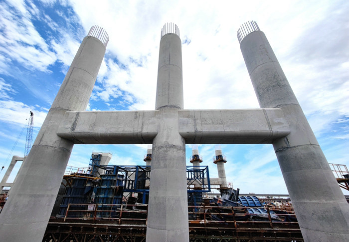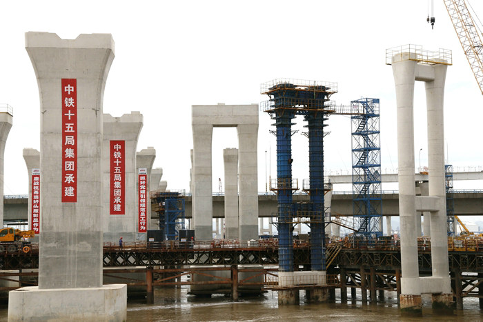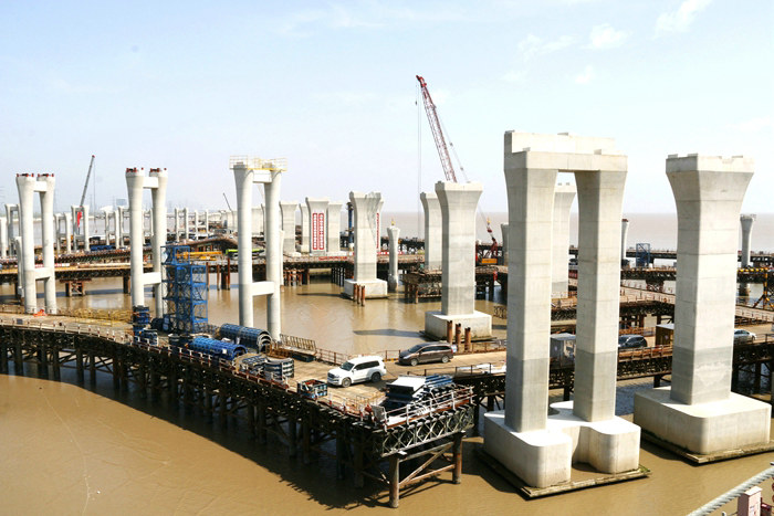 濱海互通工期4個(gè)月,時(shí)間緊、任務(wù)重、安全風(fēng)險(xiǎn)大。該項(xiàng)目部在先期完成濱海高架主體之后,去年以來(lái)采取鋼棧橋、作業(yè)平臺(tái)、樁基、承臺(tái)、橋墩、架梁等6道工序流水作業(yè)的辦法,各自為戰(zhàn)與通力合作相結(jié)合。為防止在材料調(diào)配、設(shè)備移動(dòng)、吊裝、泥漿和破樁頭混凝土塊外運(yùn)過(guò)程中相互干擾,給施工造成影響,該項(xiàng)目部在現(xiàn)場(chǎng)有專(zhuān)人指揮協(xié)調(diào),疏通海上道路,提供快捷的大通道。G匝道樁基、承臺(tái)的陸續(xù)矗立海水中,為橋墩施工做了很好的鋪墊。