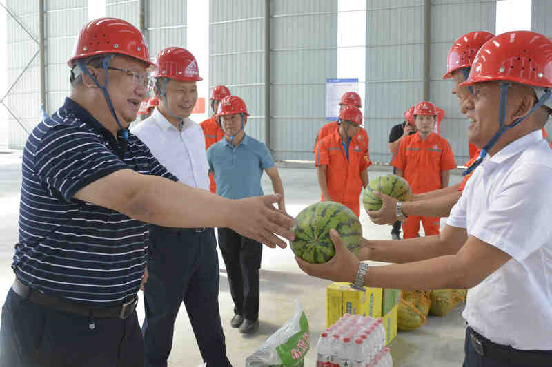 活動中, 張斌一行為職工送去水果、飲品、藥品等防暑降溫物資,向大家致以誠摯的問候,并囑托大家科學(xué)調(diào)配作息時間,統(tǒng)籌做好疫情防控、安全生產(chǎn)、防暑降溫等相關(guān)工作,并勉勵全體員工要發(fā)揚(yáng)勇于開拓、敢打硬仗的優(yōu)良作風(fēng),拓市場、保履約,確保順利完成2022年目標(biāo)任務(wù)。