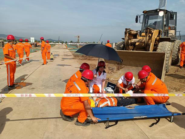本次演練為機(jī)械傷害事故應(yīng)急救援。情景模擬了裝載機(jī)駕駛員在施工作業(yè)過(guò)程中,因視線盲區(qū)誤碰工人,造成人員受機(jī)械傷害。在發(fā)生險(xiǎn)情后,該項(xiàng)目第一時(shí)間啟動(dòng)應(yīng)急預(yù)案,對(duì)施工現(xiàn)場(chǎng)進(jìn)行了緊急情況處置,應(yīng)急救援組、醫(yī)療救護(hù)組、后勤保障組等火速趕到事故現(xiàn)場(chǎng)展開(kāi)救援行動(dòng)并根據(jù)傷者情況撥打急救電話,經(jīng)過(guò)緊張有序的救援,受傷人員被送往醫(yī)院得到及時(shí)救治。過(guò)程中,各參演隊(duì)員反應(yīng)迅速、措施規(guī)范,整場(chǎng)演練流程緊湊、場(chǎng)景逼真,充分體現(xiàn)了“以人為本、科學(xué)施救”的演練理念。