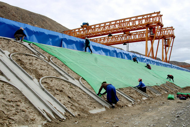 由于項(xiàng)目地處海拔4000米的高原河谷地帶,植被稀疏,風(fēng)沙大,生態(tài)環(huán)境極度薄弱。為保護(hù)環(huán)境減少揚(yáng)塵,項(xiàng)目部在完成邊坡骨架防護(hù)工作后,聘用當(dāng)?shù)夭刈迦罕娭膊菰曰ā檫m應(yīng)當(dāng)?shù)丨h(huán)境氣候,特意選用格桑花與黑麥草進(jìn)行混合播種,項(xiàng)目部在播撒草籽后用防塵蓋土網(wǎng)覆蓋,并安排水車每天灑水一次,確保草種順利發(fā)芽。