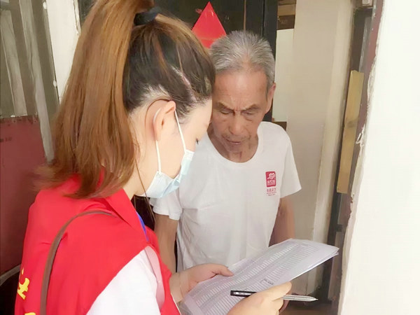 “我們來自北新路橋,是登云路社區(qū)的志愿服務(wù)者”。當(dāng)天上午,志愿者們冒著酷熱,集體前往所在的勝月苑小區(qū)。該小區(qū)共有16幢樓,每幢6層,需要一層層爬過樓梯。大家兵分三組,對(duì)照人員名冊(cè),逐一進(jìn)行上門服務(wù),詳細(xì)了解老年人對(duì)接種新冠疫苗的認(rèn)識(shí),并積極講解接種的科學(xué)性及注意事項(xiàng),同時(shí)就社區(qū)對(duì)60歲以上老人接種疫苗可領(lǐng)取免費(fèi)物資兌換活動(dòng)進(jìn)行宣傳,此次走訪服務(wù)共計(jì)150余戶。