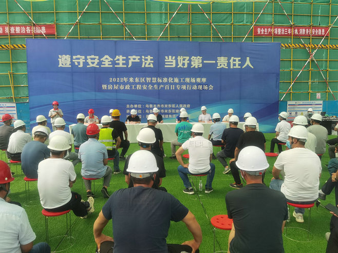 烏魯木齊訊(李楊)近日,新疆兵團(tuán)城建集團(tuán)有限公司與烏魯木齊市米東區(qū)人民政府、烏魯木齊市米東區(qū)建設(shè)局共同在兵團(tuán)十一師黨校項(xiàng)目召開(kāi)2022年米東區(qū)智慧標(biāo)準(zhǔn)化施工現(xiàn)場(chǎng)觀摩暨房屋市政工程安全生產(chǎn)月百日專(zhuān)項(xiàng)行動(dòng)現(xiàn)場(chǎng)會(huì),共有66家建筑施工單位參加了觀摩交流會(huì)議。集中學(xué)習(xí)安全生產(chǎn)法,集中組織第一責(zé)任人共同進(jìn)行安全倡議書(shū)公開(kāi)承諾,學(xué)習(xí)兵團(tuán)十一師黨校項(xiàng)目安全生產(chǎn)好的經(jīng)驗(yàn)做法。烏魯木齊市米東區(qū)建設(shè)局對(duì)安全生產(chǎn)工作提出要求,一是要思想上高度重視安全生產(chǎn)工作;二是行業(yè)部門(mén)嚴(yán)格執(zhí)法,落實(shí)安全生產(chǎn)法,加強(qiáng)大排查;三是企業(yè)主體責(zé)任落實(shí),作用發(fā)揮,嚴(yán)格履行職責(zé)。