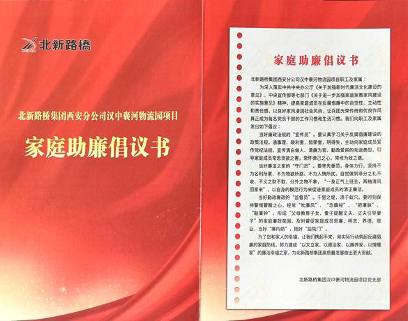 家風(fēng)清則作風(fēng)正,家風(fēng)廉則黨風(fēng)端。為聚焦發(fā)揮反腐倡廉“大后方”的作用,突出家庭在推動(dòng)黨風(fēng)廉政建設(shè)中的重要地位。近日,北新路橋集團(tuán)西安分公司漢中褒河物流園項(xiàng)目結(jié)合第二十四黨風(fēng)廉政月活動(dòng)積極開(kāi)展家庭助廉行動(dòng),以清正廉潔家風(fēng)筑牢拒腐防變堅(jiān)固堡壘。