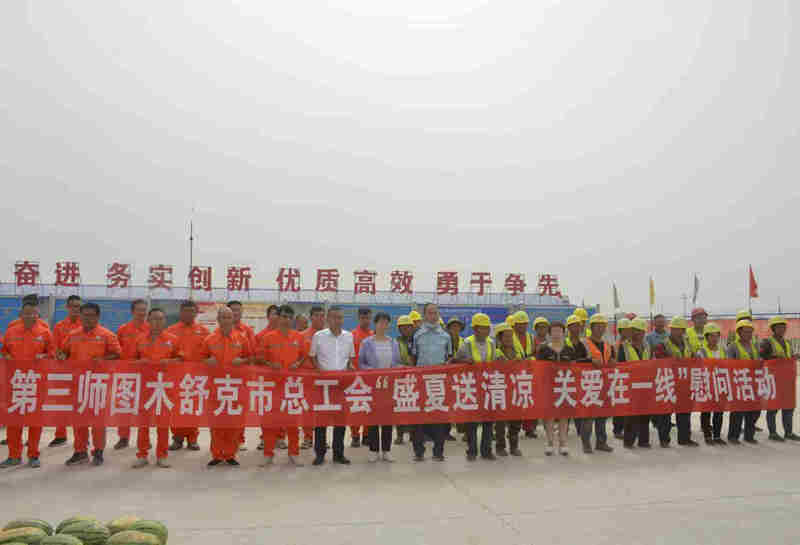 7月27日上午,第三師圖木舒克市總工會(huì)赴北新路橋集團(tuán)圖昆公路(三師段)一標(biāo)項(xiàng)目部建設(shè)一線,開展“盛夏送清涼、關(guān)愛在一線”慰問活動(dòng),三師總工會(huì)黨組書記、主席張娟,三師總醫(yī)院醫(yī)護(hù)人員、代建指揮部和項(xiàng)目人員等出席活動(dòng)。