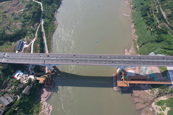 廖家溪軌道專(zhuān)用橋橋型設(shè)計(jì)為空腹鋼斜撐連續(xù)鋼構(gòu),孔跨布置為150+245+190+130+85,全長(zhǎng)800米,自西向東橫跨嘉陵江,江內(nèi)采取與上游禮嘉嘉陵江大橋平行對(duì)孔設(shè)計(jì),梁橋相距約14米。P1、P2主墩上部結(jié)構(gòu)下弦梁設(shè)計(jì)為鋼斜撐,上弦梁設(shè)計(jì)為預(yù)應(yīng)力混凝土梁,橋高72米,橋面寬13.6米,主跨245米,具有跨度大、高度較高、涉水施工及主墩上部結(jié)構(gòu)三角區(qū)施工要求高、組織難度大等顯著特點(diǎn)。