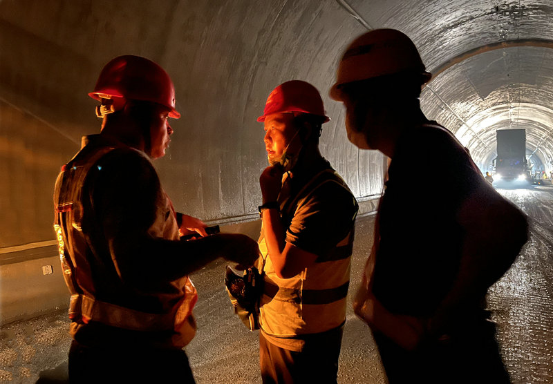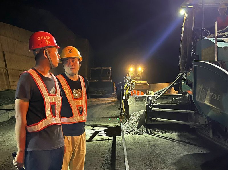 圖說 2022年8月2日23點16分,北新路橋集團(tuán)四川分公司廣平路面項目青溪隧道與橋樓隧道之間主線施工現(xiàn)場,施工隊負(fù)責(zé)人正在向項目副經(jīng)理任靖詢問操作規(guī)范。攝影 張荷