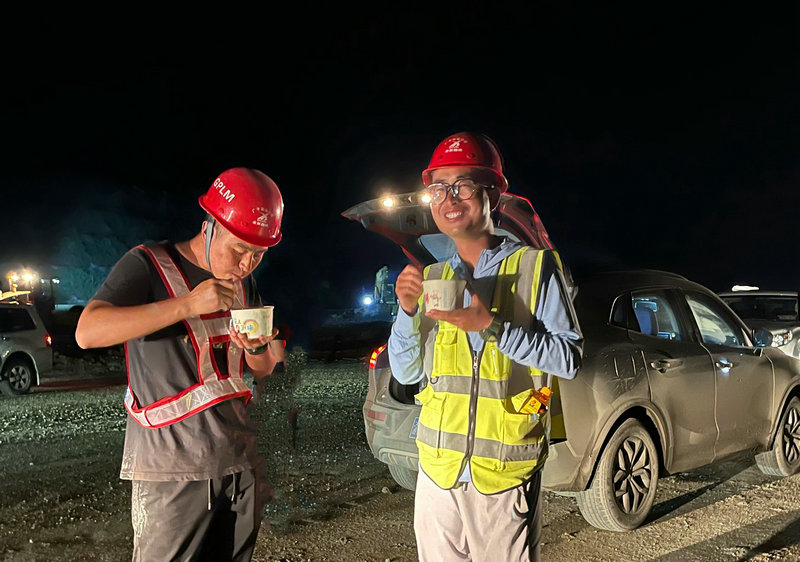圖說 2022年8月3日凌晨2點18分,廣平高速公路二郎廟大橋到青溪互通段路基旁,忙碌了一天的施工員李順超與同事任靖正在吃項目部送來的夜班加班餐。攝影 張荷