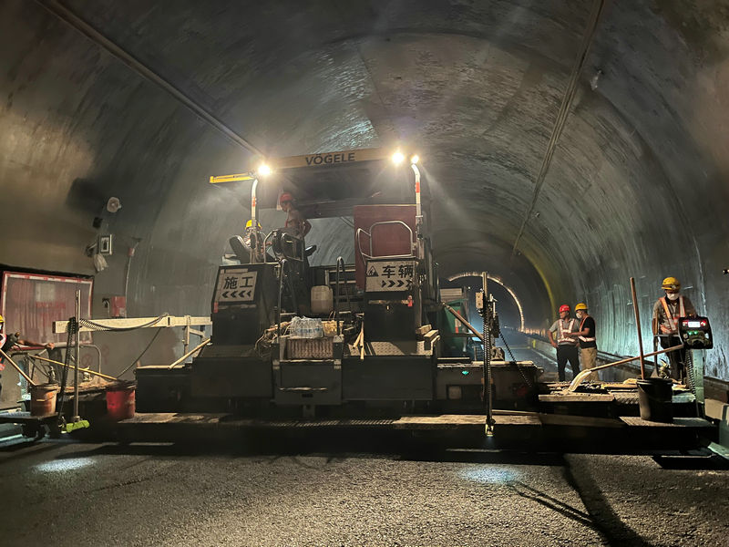 圖說 2022年8月2日23點31分,廣平高速公路青溪隧道燈火通明,北新路橋集團(tuán)四川分公司廣平路面項目部的工人們正在抓緊時間進(jìn)行瀝青中面層攤鋪。攝影 張荷