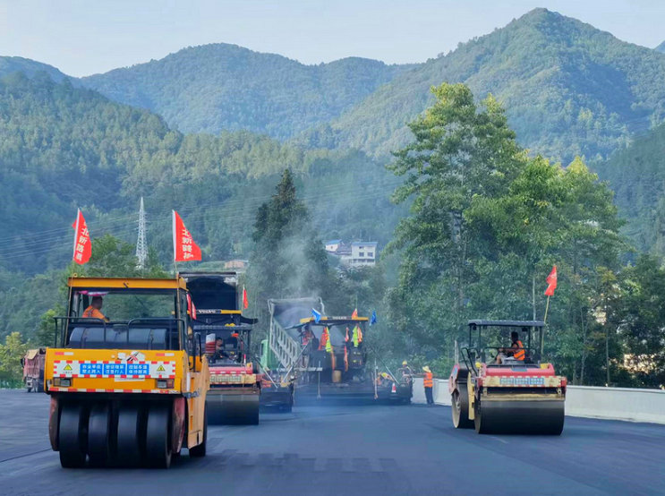 圖說 2022年8月2日18點30分,在北新路橋集團(tuán)四川分公司廣平路面項目部青川收費站路面施工現(xiàn)場,正采用雙機(jī)聯(lián)鋪的方式進(jìn)行瀝青上面層攤鋪,圖為雙鋼輪壓路機(jī)及時跟進(jìn)碾壓。攝影:李碩鑫