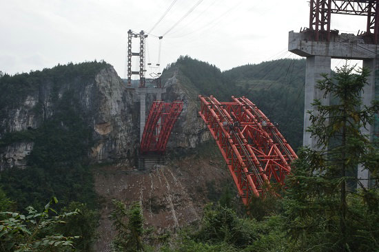 由于橋址區(qū)屬構(gòu)造溶蝕侵蝕低山丘陵地貌區(qū),深切割“V”峽谷斜(陡)地形,斜坡坡度較大,兩岸地形陡峭,局部近似直立狀,地形起伏較大,大橋施工環(huán)境極其險(xiǎn)惡。大橋軸線經(jīng)過地段地面標(biāo)高在510~693m之間,相對(duì)高差約183米。本橋橫跨找龍壩河,河流整體呈東西走向,河谷底部寬約20米,頂部寬約230米,河谷兩岸坡面上植被較發(fā)育,多為喬木、灌木。施工難度相當(dāng)大,工期十分緊,是全線的卡控點(diǎn)工程。自2017年5月開工以來,項(xiàng)目部克服諸多困難,做好施工方案評(píng)審及優(yōu)化、纜索吊機(jī)安裝及測試、首節(jié)段驗(yàn)收等各項(xiàng)工作,施工現(xiàn)場如火如荼,科學(xué)組織,緊張有序向前推進(jìn)。今年4月30日完成主拱肋的首節(jié)段吊裝,目前吊裝施工有條不紊地進(jìn)行,為深山峽谷施工積累了豐富經(jīng)驗(yàn)。