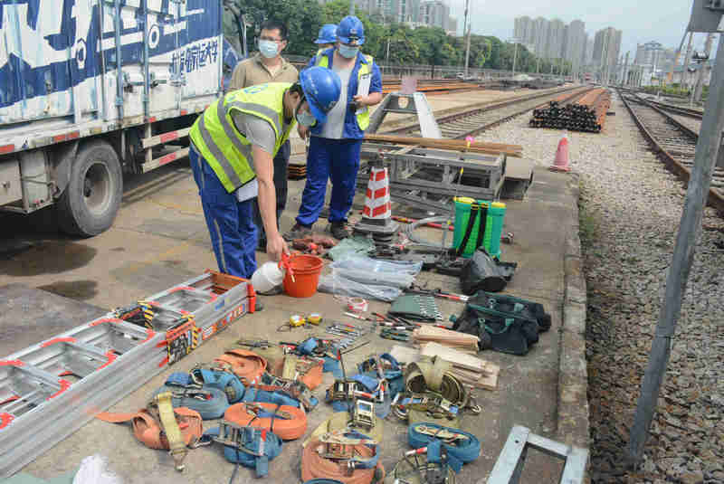 8月2日7時40分,30多名作業(yè)人員在項目部樓下整齊列隊,有序上車。此次施工任務(wù)是將11面新設(shè)備柜利用軌道車從西塱車輛段運(yùn)送到楊箕站B所的I段,再將楊箕站B所II段12面舊設(shè)備柜裝車返回西塱車輛段次日交付運(yùn)營。