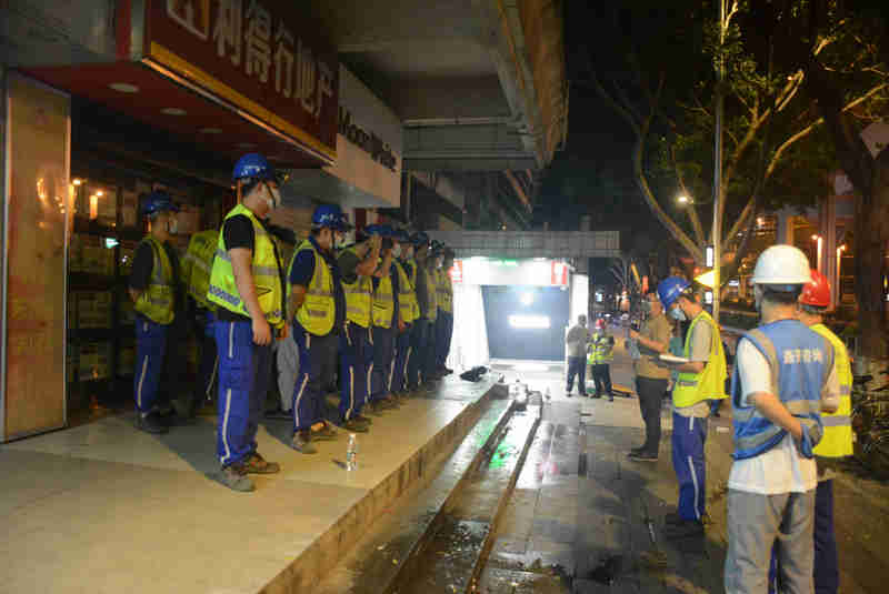 夜幕降臨,白天的燥熱卻并未消退。22時,作業(yè)人員再次列隊整齊,一字排開。隨著作業(yè)隊長周鐵巖發(fā)出的出發(fā)指令,大家浩浩蕩蕩的開赴楊箕地鐵站。