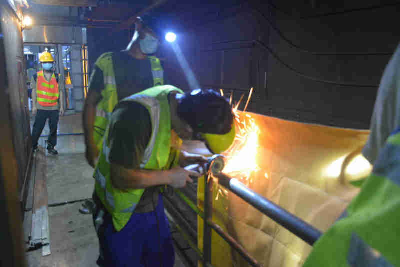 23時50分,隨著楊箕站最后一班列車駛過封閉站廳,30余名作業(yè)人員迅速進(jìn)入站廳開始作業(yè)前的準(zhǔn)備工作,先后完成防疫系列檢查、安全檢查、工器具清點、班前講話及作業(yè)安排,隨即夜間“天窗點”作業(yè)正式開始。