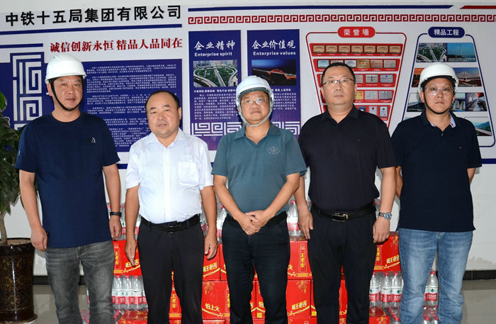 8月16日下午,寧波市鎮(zhèn)海區(qū)建設(shè)交通局總工程師王洲偉帶著礦泉水、王老吉等飲品到中鐵十五局集團(tuán)杭甬項目部慰問。
