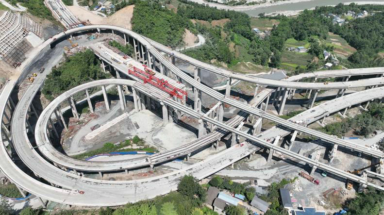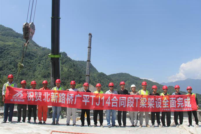 據(jù)悉,因時間緊,任務(wù)重,該項目部安排了2組架橋機雙向平行施工。因橋梁曲線半徑太小,場地受限,該項目部調(diào)配5臺平板車運輸及兩臺500噸、2臺300噸吊車進行T梁吊裝施工。經(jīng)過不懈努力,歷時2個月艱苦歷程,平武樞紐互通安全順利完成全部架梁工作,其中架梁機架設(shè)T梁202片,吊車架設(shè)T梁44片。順利扭轉(zhuǎn)了前期被動局面。