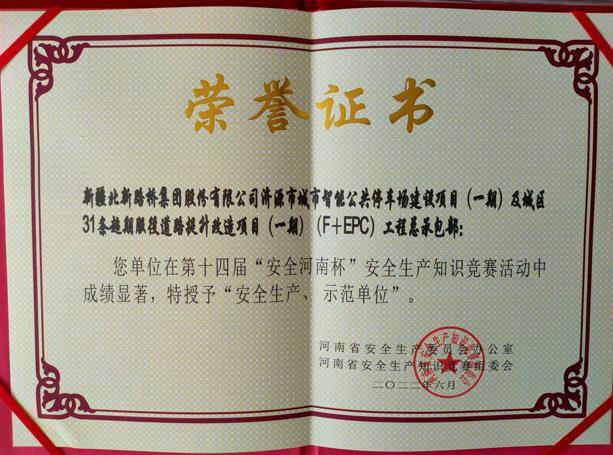 近日,從河南省安全生產(chǎn)委員會(huì)辦公室傳來(lái)喜訊,北新路橋集團(tuán)西安分公司河南濟(jì)源市政工程項(xiàng)目在第十四屆“安全河南杯”安全生產(chǎn)知識(shí)競(jìng)賽活動(dòng)中成績(jī)突出,榮獲河南省安全生產(chǎn)委員會(huì)辦公室、河南省安全生產(chǎn)知識(shí)競(jìng)賽組委會(huì)聯(lián)合授予“安全生產(chǎn)示范單位”獎(jiǎng)牌及榮譽(yù)證書。