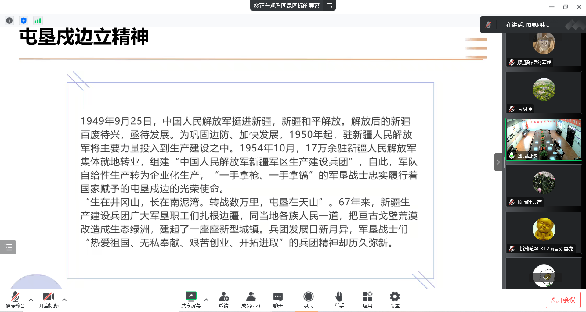 兵團職工代表王維軍為大家講述了革命老兵們在屯墾戍邊的紅色故事和勵志精神,要學(xué)習(xí)他們胸懷全局、顧全大局的精神境界。“作為引領(lǐng)時代未來的主力軍,應(yīng)當擁抱新時代,緬懷先輩付出。在深入基層中強歷練,在勇?lián)厝沃写僬衽d,讓兵團精神“活”起來;“走”出去!”