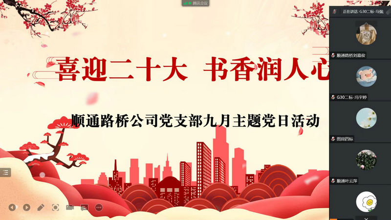 石河子訊(王鳳)順通路橋公司依托新時代文明實踐(站)和九月主題黨日內(nèi)容,在普天同慶的國慶來臨之際,通過線上分享的方式舉辦了“喜迎二十大 書香潤人心”讀書分享會活動,本次活動秉著黨建帶團建的新型模式,以“閱讀一本好書,進行一次分享,提升一層素養(yǎng),收獲一份快樂”為主線,暢談各位青年工作者的讀書心得,進一步激發(fā)廣大黨員干部、團員青年、群眾的愛黨愛國熱情,領(lǐng)悟黨的根本宗旨和初心使命,不斷從讀書學(xué)習(xí)成果中汲取新的智慧和力量。
