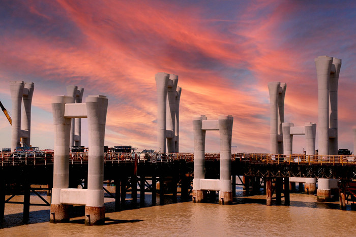 濱?;ネ⒔晃挥跂|海的寧波鎮(zhèn)海區(qū)淺海水域,由5座拼寬橋和8座匝道橋構(gòu)成,設(shè)計(jì)橋墩420座,其中B匝道58座、C匝道34座,混凝土3002.2立方。主線橋墩和匝道橋墩3次上跨、4次下穿寧波通往舟山唯一海上交通要塞——金塘大橋,并跨越海底多條管線,潛在的安全隱患和風(fēng)險(xiǎn)很高,對(duì)首次承建海上立交的項(xiàng)目部管理團(tuán)隊(duì)是一次施工管理的嚴(yán)峻考驗(yàn)。B、C匝道分布在互通東西兩側(cè)外延,呈半個(gè)月亮形延伸開來,一端與主線橋相接,另一端與金塘大橋接壤,氣勢(shì)宏偉,蔚為壯觀。在施工中,該項(xiàng)目部采取棧橋、樁基、墩身分步驟施工、工序銜接緊密等策略,充分運(yùn)用科技手段,成功跨越海底管線,征服堅(jiān)硬泥巖、碎巖,戰(zhàn)勝4次超強(qiáng)臺(tái)風(fēng)和酷熱、嚴(yán)寒、暴雨等惡劣天氣,不因自然災(zāi)害頻發(fā)而影響進(jìn)度和安全質(zhì)量。廣大管理、技術(shù)人員堅(jiān)持長年累月天天到現(xiàn)場(chǎng)檢查指導(dǎo),解決疑難問題,一個(gè)個(gè)“攔路虎”被攻克,疏通“瓶頸”,坎坷變坦途。在項(xiàng)目部的科學(xué)管理下,各施工隊(duì)合理安排人員和機(jī)械設(shè)備,滿負(fù)荷作業(yè),人與機(jī)械共舞,在濱?;ネㄗ囗懯┕ず椭C有序的“協(xié)奏曲”。棧橋的快速推進(jìn)、樁基的躍出海面,為墩柱施工提供了保障。
