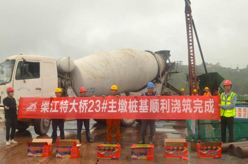 10月5日上午,隨著最后一車混泥土的澆筑,由北新路橋集團(tuán)北新融建公司承建的重慶雙錢高速公路土建施工SQTJ1標(biāo)段渠江特大橋23#主墩樁基順利澆筑完成,標(biāo)志著渠江特大橋東岸主墩樁基全部完成澆筑,東岸順利完成第一道工序,下一步將有序推進(jìn)圍堰及承臺(tái)基坑施工。