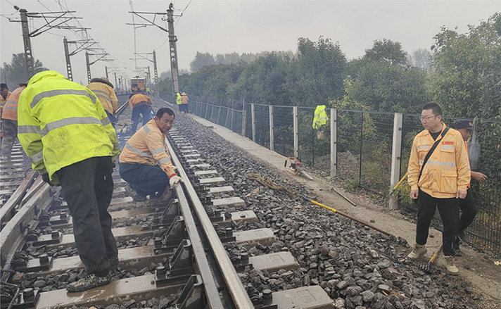 小雨下個不?!,F(xiàn)場中,二十多名職工冒雨緊張地作業(yè)著。二個多小時的封鎖天窗,要完成三組道岔的配合作業(yè),時間緊,任務重,必須爭分奪秒同時間賽跑。胡守峰指揮起道后,就緊跟從職工手中接過內燃搗鎬。三堂集維修副工長張向陽放下道尺,拿起拉耙整理道床。操作手不使用起道機就幫忙回填道床,作業(yè)人員個個爭先恐后,為全面完成施工任務,確保安全正點,心向一處想,勁向一處使。