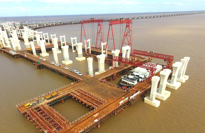 杭甬復(fù)線濱?;ネㄊ莵喼拮畲蟮暮I匣ネ屑~,由2390米主線橋、4座1320米拼寬橋、8座5995米匝道橋、634座墩柱、493片鋼混箱梁構(gòu)成。鋼箱梁生產(chǎn)、架設(shè)是濱?;ネê笃谑┕さ?ldquo;重頭戲”,受到浙江省各級(jí)政府、業(yè)主、交通等多方的高度關(guān)注。根據(jù)集團(tuán)公司的要求,2021年10月底開始生產(chǎn)第一片梁,為如期完成任務(wù),該項(xiàng)目前期做了大量艱苦細(xì)致的工作,組織有關(guān)人員起草方案,并進(jìn)行反復(fù)修改確保安全、質(zhì)量、進(jìn)度的可行性方案,多次召開由多名橋梁、水利、海洋專家組成的方案評(píng)審會(huì),選定了鋼箱梁生產(chǎn)廠家,敲定了生產(chǎn)、運(yùn)輸、裝卸、架設(shè)等多項(xiàng)方案,為加速推進(jìn)每一項(xiàng)方案的落地做了充分準(zhǔn)備。與此同時(shí),該項(xiàng)目指派管理、技術(shù)人員現(xiàn)場(chǎng)指導(dǎo),于2021年10月29日提前兩天在舟山進(jìn)行20米—60米的鋼箱梁生產(chǎn),12月29日在濱?;ネ茉O(shè)第一片梁。其次,同步將加工制作成20噸到30噸的鋼箱梁再鋪設(shè)鋼筋網(wǎng)、澆筑混凝土,變成130噸—170噸的疊合梁,生產(chǎn)過程有條不紊。由299片鋼箱梁加工成鋼混疊合梁,用貨船從舟山經(jīng)過數(shù)小時(shí)的航運(yùn),抵達(dá)杭甬濱?;ネㄐ读赫荆儆纱罂ㄜ囘\(yùn)至提梁站,由兩個(gè)大型龍門吊將一片片梁安裝到橋墩上。