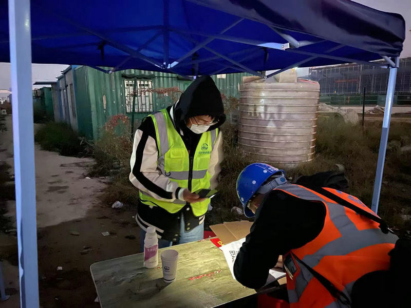 項目組織青年員工在核酸檢測現(xiàn)場維持秩序,組織項目施工人員有序排隊,幫助使用老年機的人員進行身份證登記,提醒人員打開安康碼,幫助核酸檢測人員進行掃碼。為全面把住入口關(guān),項目安排了員工進行24小時值班,對工地、項目部、生活區(qū)進入人員查看兩碼、登記信息,確保項目的施工、人員安全。
