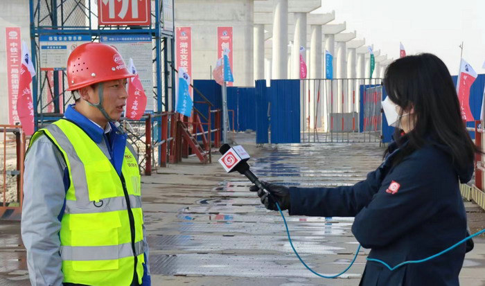 圖為項目負(fù)責(zé)人黎衛(wèi)國接受湖北孝感電視臺記者采訪 老府河特大橋作為孝漢應(yīng)項目的控制性工程,也是中鐵二十一局三公司在建項目中的重難點工程之一,老府河特大橋主橋橋址處多為砂層,主橋橋型布置為(90+160+90)米變截面連續(xù)箱梁,技術(shù)含量高、施工條件差。主橋34#和35#主墩之間跨越老府河 V 級航道,跨徑大,施工難度高,工期壓力大。為確保項目各項節(jié)點如期完成,該項目自上場以來連續(xù)不間斷施工,在春節(jié)期間大橋主墩懸臂梁仍正常施工建設(shè),以全力確保老府河特大橋按照項目節(jié)點如期完工。
