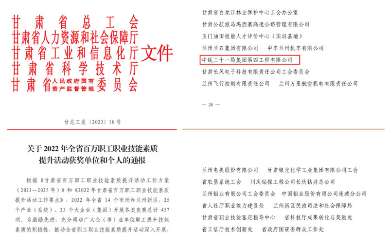 近日,從甘肅省總工會獲悉,中鐵二十一局四公司在甘肅省2022年百萬職工職業(yè)技能素質提升活動中被評為優(yōu)秀組織單位。