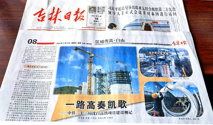 “初冬時(shí)節(jié),捷報(bào)頻傳。灣溝北站站場破土動(dòng)工,中鐵二十三局沈白高鐵建設(shè)項(xiàng)目全線啟動(dòng);碧水奔流,聲震峽谷。灣溝特大橋、跨201國道大橋、湯河1#2#3#大橋等橋墩巍然挺立,經(jīng)受住了滔滔洪水的嚴(yán)峻考驗(yàn);施工現(xiàn)場,機(jī)聲隆隆。掌子面上工人們手持鑿巖機(jī)緊張作業(yè),不斷改寫掘進(jìn)日進(jìn)尺的最新紀(jì)錄……一條條隧道、一座座橋梁、一段段路基,穿越大山、跨過江河、橫跨村屯,講述著沈白高鐵項(xiàng)目建設(shè)的動(dòng)人故事,展現(xiàn)著中鐵二十三局全體建設(shè)者的時(shí)代風(fēng)采。”這是長篇通訊《一路高奏凱歌》的“開場白”。