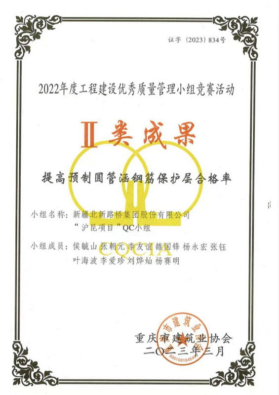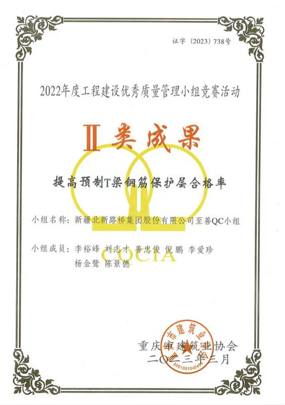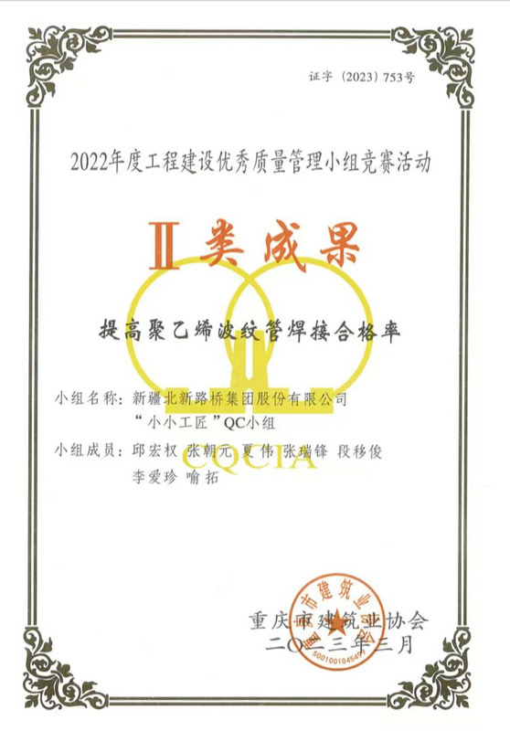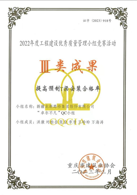 長沙訊(通訊員:盧仕磊)近日,從重慶市建筑業(yè)協(xié)會傳來捷報,由北新路橋集團(tuán)長沙分公司牽頭組織、創(chuàng)立并負(fù)責(zé)申報的QC成果榮獲Ⅱ類成果、Ⅲ類成果各3項的優(yōu)異成績。