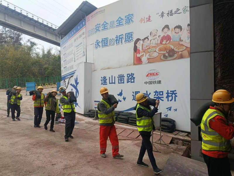此次防洪演練模擬內(nèi)容為,中梁山隧道進(jìn)口因近期持續(xù)降雨,洞口及棄土場區(qū)水位上漲、積水增加的趨勢,隨時可能發(fā)生洪水倒灌隧道洞口,現(xiàn)場安全總監(jiān)立即向項目經(jīng)理報告現(xiàn)場情況,一方面開展人員撤離,另一方面組織人員堆碼沙袋、疏散警戒、人員應(yīng)急搶險等模擬演練。目的是檢驗隧道施工人員應(yīng)急響應(yīng)、現(xiàn)場搶險、事故報告、應(yīng)急處置、應(yīng)急預(yù)案的可操作性和現(xiàn)場應(yīng)急處置能力。