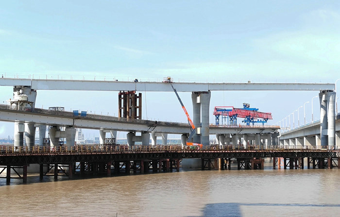 濱?;ネㄈL9705米,其中主線橋2390米、8座匝道橋5995米、4座拼寬橋1320米。該橋設(shè)橋墩636座、鋼混疊合梁470片,其中拼寬橋墩117座、鋼混疊合梁58片。4座拼寬橋呈喇叭狀,由窄向?qū)捿椛洌瑥臋M排2座橋墩延伸到6座,其中2座拼寬橋兩端與金塘大橋東西相連,另外2座與主線橋相接,形成穩(wěn)固的陣型。完成濱海互通232跨470片架梁任務(wù),是該項(xiàng)目部今年上半年的沖刺目標(biāo),受審批手續(xù)時(shí)間長、大風(fēng)天氣等影響,工期緊、壓力大,而且3座匝道橋上跨金塘大橋,安全風(fēng)險(xiǎn)高,給施工帶來諸多挑戰(zhàn)。為實(shí)現(xiàn)6月底架梁收官目標(biāo),該項(xiàng)目采取多項(xiàng)舉措為架梁提供保障。首先由公路運(yùn)梁、租賃碼頭卸梁,經(jīng)大貨車曲線運(yùn)至工地改為運(yùn)梁船從舟山入海直抵寧波海域?yàn)I海互通卸梁站港池,然后由兩臺龍門吊提至存梁區(qū),再由運(yùn)梁車陸續(xù)運(yùn)至匝道架梁處,大大縮短了運(yùn)距,節(jié)省了運(yùn)梁時(shí)間和成本。在此基礎(chǔ)上,項(xiàng)目部開展為期90天的六比六創(chuàng)勞動(dòng)競賽活動(dòng),激發(fā)全員的正能量,為“多快好省”建言獻(xiàn)策。他們在原兩臺架橋機(jī)、兩臺履帶吊架梁的同時(shí),3月下旬增加兩臺150噸的履帶吊,如虎添翼,5條匝道架梁“開足馬力”再提速,日架3—6片鋼混疊合梁,天天刷新記錄,為推進(jìn)4座拼寬橋架梁進(jìn)行了充分“余熱”。在安全管理上,周密部署,不留隱患。為確保運(yùn)梁、架梁安全,該項(xiàng)目部派人全程押送海上運(yùn)梁船,遇到7級以上大風(fēng)不出港,保證貨船、船老大和押運(yùn)人的絕對安全。現(xiàn)場分管匝道和拼寬橋架梁的副經(jīng)理、安全總監(jiān)、安全監(jiān)督部長和專職安全員,從早到晚督導(dǎo)運(yùn)梁、架梁等各工序嚴(yán)格按照安全操作規(guī)范作業(yè),筑牢安全屏障。
