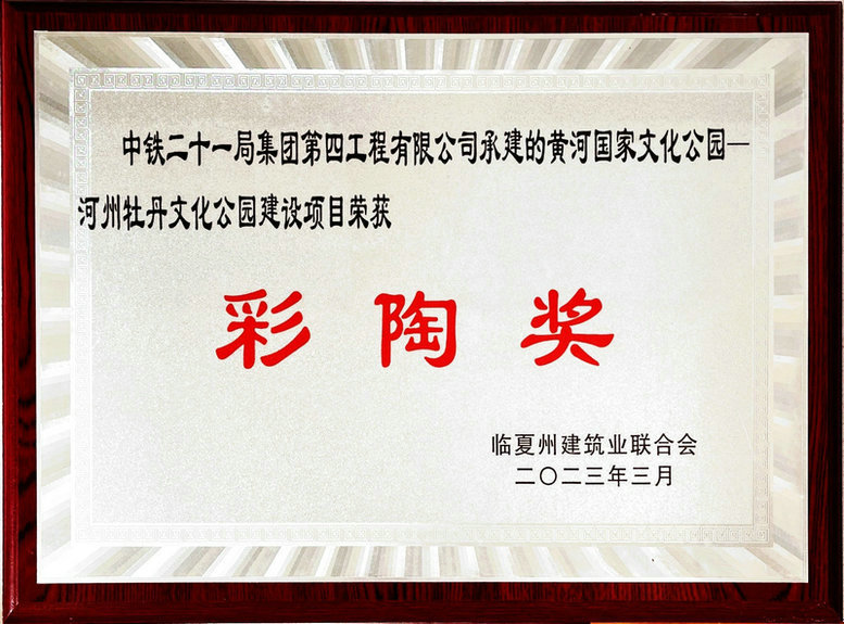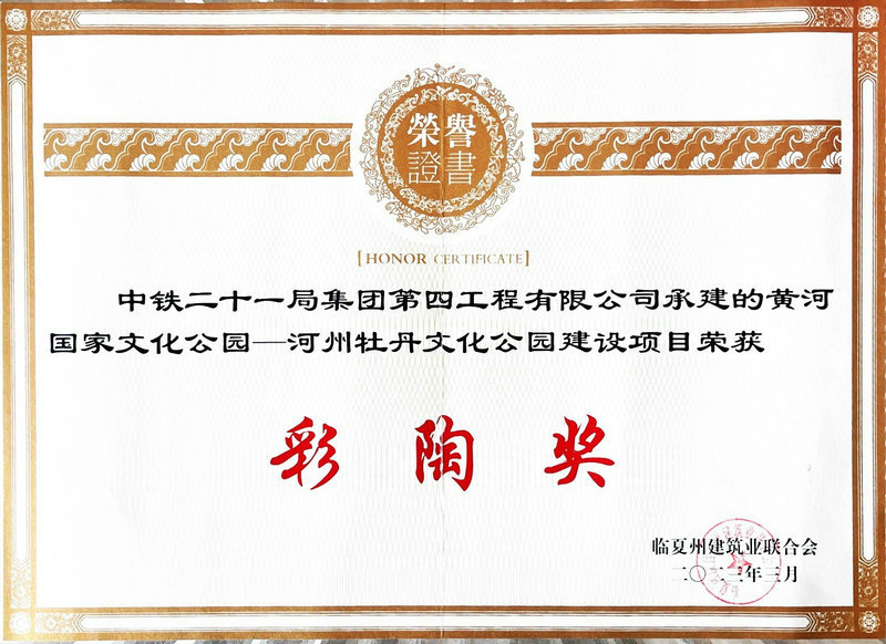 近日,由中鐵二十一局四公司承建的黃河國家文化公園—河州牡丹文化公園建設(shè)項目榮獲臨夏州建筑業(yè)聯(lián)合會頒發(fā)的2022年度臨夏州建筑業(yè)彩陶獎。