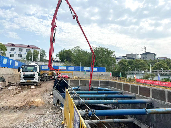 污水處理廠擴容工程占地面積0.35公頃,擴建規(guī)模1萬m/d,是廬山城鄉(xiāng)污水治理工程重難點工程。工藝流程為:預(yù)處理+BFM工藝+連續(xù)砂濾池,出水水質(zhì)一級A排放標準。包含結(jié)構(gòu)、建筑、設(shè)備、電氣、自控、暖通等專業(yè);新建的構(gòu)(建)筑物有:細格柵及旋流沉沙池、BFM-B池、BFM-M池、鼓風(fēng)機房、生物除臭裝置、流量計井等。此次澆筑的是該構(gòu)筑物BFM-B池底板,基坑尺寸為26.7*13.7*9.45m,地下9.45m;約300立方混凝土。為順利完成澆筑任務(wù),施工前期項目部制訂了切實可行的施工方案,并對作業(yè)人員進行詳細的技術(shù)、安全交底,精心組織,工序銜接緊密,嚴格按照施工規(guī)范和操作規(guī)程進行,為7月底完成節(jié)點目標奠定了基礎(chǔ)。