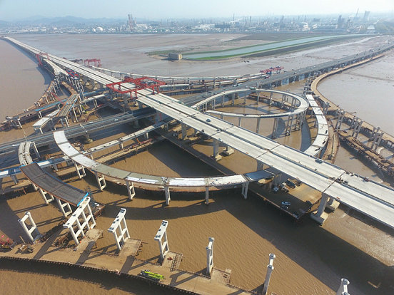 橋面施工隊(duì)在5座匝道橋上鋪設(shè)、綁扎鋼筋,橫豎排開的鋼筋間隔距離嚴(yán)格控制在規(guī)定的誤差范圍內(nèi),作業(yè)人員熟練的手法令人眼花繚亂。負(fù)責(zé)安裝橋面兩側(cè)角鋼支架的人員,分為兩人一組,在登高車靈活的移動(dòng)下,忽而上忽而下,用螺桿和螺帽將支撐架固定住,以滿足立模、鋪設(shè)鋼筋和澆筑混凝土需要。在A匝道橋面上,只見一臺(tái)裝滿混凝土的罐車,被一臺(tái)履帶吊像抓小雞一樣提起,慢慢升空,向東移動(dòng),平穩(wěn)地放在橋面上,開始運(yùn)作,在混凝土泵車的配合下,將罐內(nèi)輸出的混凝土像竹筒倒豆子一樣呼呼啦啦澆筑在鋪設(shè)完畢的鋼筋網(wǎng)上。負(fù)責(zé)攤鋪的作業(yè)工人舞動(dòng)著鐵鍬將混凝土均勻地?cái)偲剑腥笋R上操作電動(dòng)震動(dòng)器,從頭至尾將混凝土震動(dòng)一遍。最后一道工序是抹面,緊跟著有人在混凝土面上反復(fù)滑動(dòng)著鋼抹子,時(shí)而推,時(shí)而壓,時(shí)而拍打兩下,直到光滑平整為止。