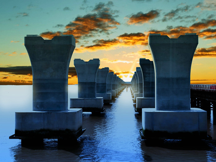 架梁隊(duì)的員工對(duì)流水作業(yè)般的工序流程非常熟悉,當(dāng)從舟山運(yùn)梁的貨船駛進(jìn)“港池”,便有人麻利地操縱龍門吊,在人工配合下,將一片片重達(dá)170噸的鋼混疊合梁吊起來,沿著軌道向后緩緩滑行到20多米處的存梁區(qū),由運(yùn)梁車安全地轉(zhuǎn)運(yùn)到指定位置,兩臺(tái)各150噸的履帶吊合力將疊合梁舉起來,慢慢提升到20多米的高度,然后降落,平穩(wěn)地落在橋墩上。當(dāng)?shù)诙喊卜诺轿缓?,立刻用螺桿和螺帽將兩片梁進(jìn)行固定,然后由電焊工對(duì)兩片梁進(jìn)行收尾焊接。夜間匝道橋焊接橋梁的焊花,猶如無數(shù)根金絲線從高處潑灑下來,點(diǎn)亮了夜空,是暗夜里一道奪目的風(fēng)景,吸引著夜間現(xiàn)場值班人員的目光。