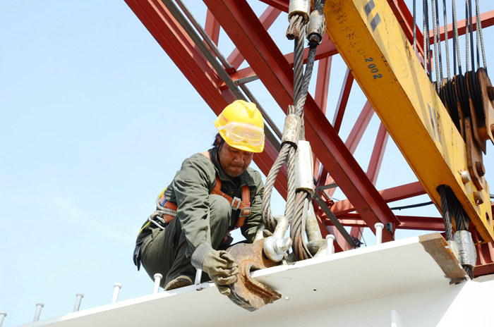 濱?;ネㄗ湓跂|海之濱的鎮(zhèn)海淺海水域,占地613.03畝,全長(zhǎng)9705米,由1座主線、4座拼寬、8座匝道構(gòu)成,主線和3座匝道橋上跨甬舟高速金塘大橋,縱橫交錯(cuò),工藝復(fù)雜,安全風(fēng)險(xiǎn)高。濱?;ネㄖ骶€、1座匝道已成功上跨金塘大橋,為拼寬橋施工積累了寶貴的經(jīng)驗(yàn)。4座拼寬橋全長(zhǎng)1320米,設(shè)37座橋墩、22跨、28片梁,每跨60米,是匝道分叉和連接金塘大橋的重要紐帶。其中金塘2號(hào)拼寬橋全長(zhǎng)360米,有10座橋墩、6跨、7片梁。由于受海上季風(fēng)和大到暴雨的干擾,春夏之交的氣候?qū)I线\(yùn)梁、架梁十分不利。為了保證安全,中鐵十五局集團(tuán)杭甬項(xiàng)目部根據(jù)氣象預(yù)告,大風(fēng)、大雨和暴雨天停止疊合梁海運(yùn)和架梁作業(yè),除此之外,小雨、6級(jí)以下的風(fēng)力天氣正常施工。同時(shí),在拼寬橋墩之間跨度長(zhǎng)達(dá)60米、架梁安全風(fēng)險(xiǎn)高的情況下,全部由履帶吊架梁,先將兩片30米的梁一頭放在橋墩上,另一頭落在中間支墩上,采用新型焊接技術(shù)將中間兩端作無(wú)縫焊接處理,達(dá)到橋梁承重要求。架梁是連續(xù)性工藝,白天架梁,夜間作業(yè)人員在登高車(chē)的助力下進(jìn)行焊接,并用螺桿螺帽連接左右兩片梁。這些工序完成后進(jìn)行橋面系施工。
