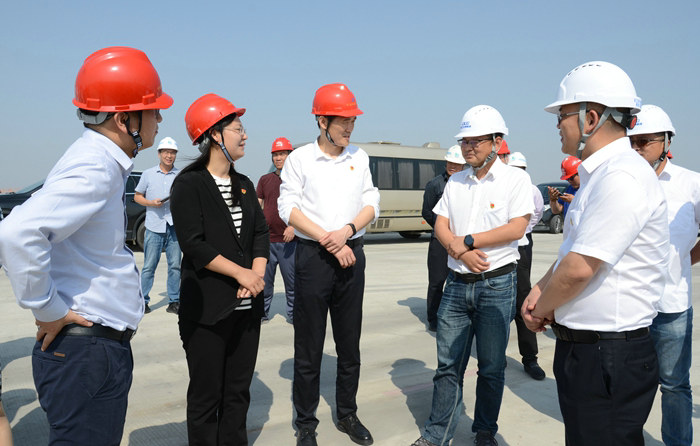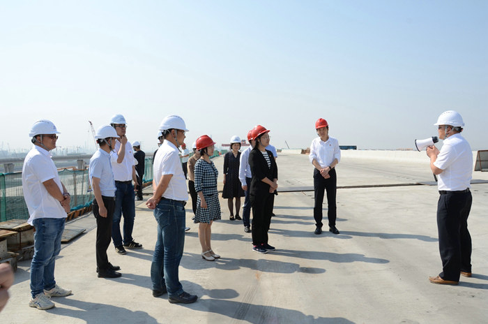 下午3點(diǎn),由共青團(tuán)寧波市委書記馬熒波帶隊(duì)的黨團(tuán)員代表觀摩團(tuán),沿濱海高架一路向南來到濱?;ネㄖ骶€橋中心區(qū)域,聽取了浙江交投交通建設(shè)管理公司副總經(jīng)理?xiàng)畛砂埠凸靖笨偨?jīng)理兼杭甬項(xiàng)目黨支部書記、項(xiàng)目負(fù)責(zé)人黃偉關(guān)于十五局承建的濱海互通項(xiàng)目規(guī)模、影響力、開工時(shí)間、竣工日期,樁基、橋墩數(shù)量,施工難度、架梁進(jìn)展及完成投資等情況介紹。觀摩團(tuán)成員的目光像掃描儀一樣對(duì)工地進(jìn)行全方位掃視,被這座亞洲最大的海上互通所震撼。他們望著不遠(yuǎn)處筑路工人頭頂火辣辣的太陽,腳踩滾燙的地面埋頭綁扎橋面鋼筋網(wǎng),操縱架橋機(jī)、履帶吊架梁的場(chǎng)面,被深深地感動(dòng)著。
