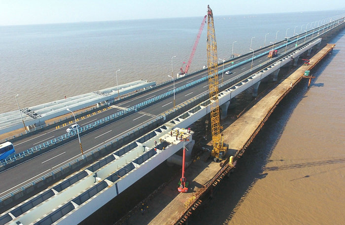 鐵路工程建設(shè)網(wǎng)24日寧波電(特約通訊員呂奎元 通訊員趙文浩)5月23日,一臺(tái)履帶吊將一片約10噸重的長方形鋼混結(jié)構(gòu)橋面板安放在濱?;ネ?號(hào)拼寬橋鋼箱梁上,至此,由浙江交通集團(tuán)牽頭建設(shè)、中鐵十五局承建的杭甬項(xiàng)目濱?;ネㄆ磳挊蛎姘暹M(jìn)入與金塘大橋銜接施工階段。