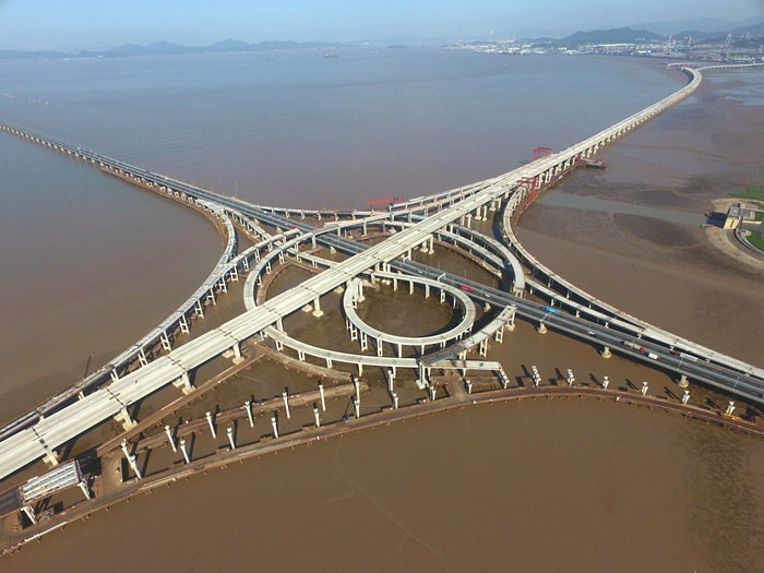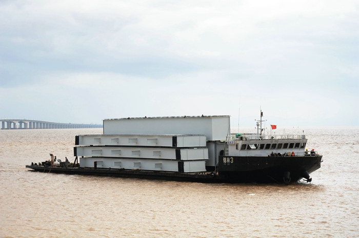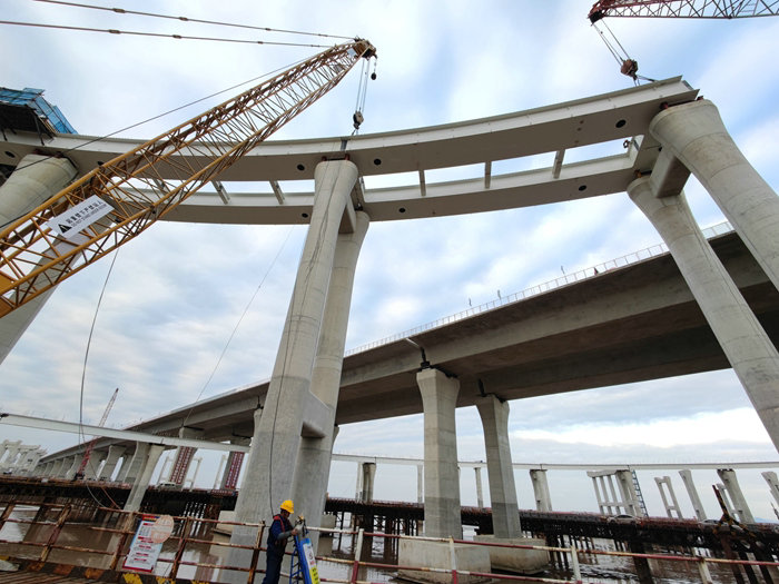 杭甬高速濱?;ネㄕ加煤S蛎娣e613.03畝,呈苜蓿葉狀,全長9705延米,是目前亞洲最大的海上互通。其中,匝道橋8條,每2條交匯拼寬后與既有線甬舟高速金塘大橋相接,共有20~30米長的鋼混疊合梁470片,鋼材總量2.4萬多立方。因A、D、F三條匝道上跨金塘大橋,縱橫交錯,工藝復(fù)雜,安全風(fēng)險高。中鐵十五局在上部結(jié)構(gòu)施工中遇到重重困難,首先是制梁難題。經(jīng)過多方考察最終確定在舟山長虹鋼結(jié)構(gòu)有限公司生產(chǎn)加工鋼混疊合梁,派出經(jīng)驗(yàn)豐富的管理、技術(shù)人員進(jìn)駐該公司監(jiān)督管控施工質(zhì)量,第一片梁于2021年10月底誕生。濱海互通在樁基、承臺、橋墩施工的基礎(chǔ)上,決定對完工的部分匝道橋墩開展架梁施工。運(yùn)梁難題必須馬上解決,否則預(yù)定的架梁計劃難以實(shí)施。采用大構(gòu)件拖車經(jīng)甬舟高速運(yùn)梁,因體積超大,拖車行駛緩慢且險象環(huán)生。為避免發(fā)生意外,改為海上舟船運(yùn)輸至寧波石化區(qū)碼頭,再由大貨車轉(zhuǎn)運(yùn)至工地。在運(yùn)作過程中,因運(yùn)輸線路為一個巨大的U型,運(yùn)距遠(yuǎn),費(fèi)時費(fèi)力費(fèi)用高。項(xiàng)目部積極組織開展“六比六看.鐵建先鋒杯”勞動競賽活動,激發(fā)全員崗位創(chuàng)新熱情,紛紛建言獻(xiàn)策。主管領(lǐng)導(dǎo)集思廣益,優(yōu)化運(yùn)梁最佳方案,在濱?;ネ隙宋恢媒ㄆ?座由兩臺龍門吊與一座深數(shù)十米、寬30多米的港池構(gòu)成的卸梁站和2座由大型龍門吊、軌道等組成的提梁站,打開了舟山與濱?;ネ▍^(qū)的海上直線運(yùn)梁通道,加快了運(yùn)梁速度,降低了安全風(fēng)險,節(jié)省了一大筆轉(zhuǎn)運(yùn)資金,2021年12月29日在G匝道開架。