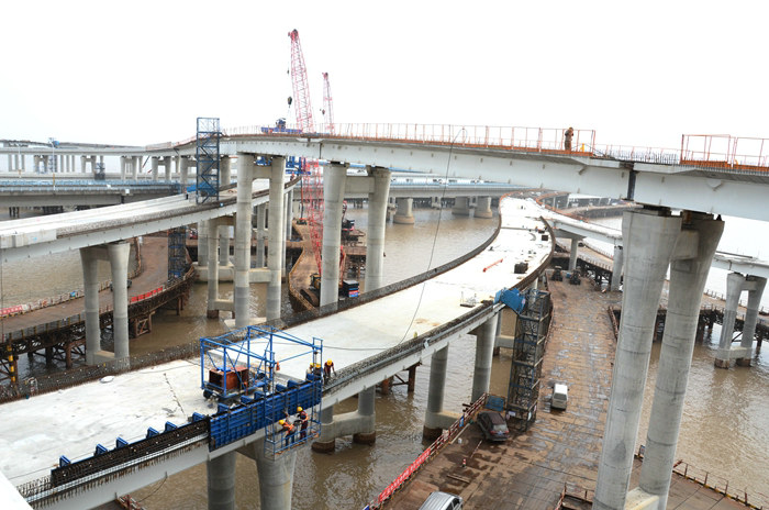 濱?;ネㄈL9705米,由1座主線、4座拼寬和8座匝道橋組成,呈苜蓿葉狀,設(shè)計(jì)470片鋼混疊合梁,3條匝道上跨甬舟高速金塘大橋,4條匝道與金堂大橋東西兩側(cè)相交,是亞洲最大的海上互通。其中B匝道全長786.068米,鋼混疊合梁60片、30米長,梁面寬,且為曲線,最大縱坡3.7%、橫坡3%,架橋機(jī)過孔時(shí),支腿調(diào)整難度大,運(yùn)梁車橫坡調(diào)整功能和轉(zhuǎn)向功能必須正常,由于是偏載運(yùn)梁,曲線喂梁,運(yùn)梁過程中必須處于平穩(wěn)狀態(tài),避免傾覆。海上高空架梁安全風(fēng)險(xiǎn)高,不易察覺的隱患多。針對這一現(xiàn)象,他們從卸梁站、提梁站再到履帶吊起吊、運(yùn)梁車運(yùn)梁、喂梁、架設(shè)、安放等每個(gè)環(huán)節(jié),保持高度的安全警惕性,4名副經(jīng)理,以及安全總監(jiān)、安全部長等現(xiàn)場管理人員,不放過任何蛛絲馬跡,上午和下午架梁前都要仔細(xì)排查一遍,是否存在不安全苗頭,鋼絲繩、滑輪、吊鉤有無破損、老化、卡簧失靈等細(xì)微變化,機(jī)械設(shè)備完全達(dá)到最佳狀態(tài),才準(zhǔn)許作業(yè)。公司副總經(jīng)理兼杭甬項(xiàng)目黨支部書記、項(xiàng)目負(fù)責(zé)人黃偉,三天兩頭深入濱?;ネ芰含F(xiàn)場指導(dǎo)施工,就地解決難題,保證卸梁、提梁、運(yùn)梁、架梁等每一道工序不出任何紕漏。