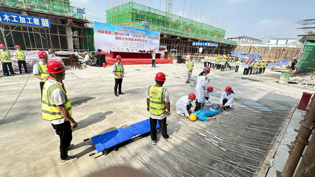 高墜演練現(xiàn)場設(shè)在和諧家園二期10#樓北側(cè),模擬一名架子工在車庫頂板搭設(shè)臨邊防護時,因未按要求正確使用安全帶不慎墜落,發(fā)生高墜事故。演練從發(fā)現(xiàn)傷員、通知現(xiàn)場安全人員、向項目部匯報、啟動項目緊急救援預(yù)案、現(xiàn)場聯(lián)絡(luò)組、搶險組、保衛(wèi)組、救護組、后勤組緊急集合,按照項目部應(yīng)急預(yù)案迅速開展救援全部環(huán)節(jié)。演練過程場景逼真、人員緊密配合、各盡其責、救援有序,充分展示了事故處理過程中的緊急搶救能力,進一步提高了參建人員的防范意識和處理突發(fā)事件的能力,保障項目安全有序推進。