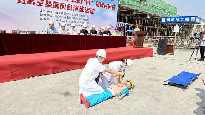 為進一步加強員工的安全意識,克服麻痹僥幸心理,提高意外事故的搶險救援和自我防范能力,切實掌握發(fā)生高空墜落事故后的應(yīng)急處置方法。6月20日,中鐵二十一局四公司臨沂東部商城項目部開展2023年“安全生產(chǎn)月”宣傳咨詢?nèi)蒸吒呖諌嬄鋺?yīng)急演練活動。臨沂東城建設(shè)投資集團有限公司、山東天健信達工程咨詢有限公司、劉店子醫(yī)院等相關(guān)領(lǐng)導(dǎo)出席本次活動。
