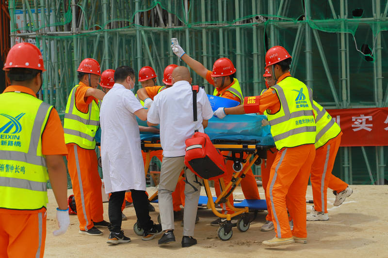 隨著演練總指揮一聲指令,演練正式開始,所有參練人員著裝整齊,按照應(yīng)急預(yù)案分工組織實(shí)施。此次演練模擬因天氣較熱,施工人員在爬梯塔過(guò)程中腳下踩空,不慎從5米多高的臨邊防護(hù)處跌落摔傷,頭部出血,陷入昏迷狀態(tài)。事故發(fā)生后同班作業(yè)人員立即報(bào)告安全員,安全員立即撥打救援電話,迅速向上級(jí)簡(jiǎn)要報(bào)告事故情況(事故發(fā)生地點(diǎn)、人員傷亡情況等),立即啟動(dòng)應(yīng)急救援預(yù)案,并對(duì)受傷人員采取臨時(shí)救助。救援小組快速判斷事故狀況并拉起警戒線,進(jìn)行救援。隨著救護(hù)車到達(dá)事故現(xiàn)場(chǎng),傷員被安全送往醫(yī)院,險(xiǎn)情告一段落。事故調(diào)查組隨即對(duì)事故展開調(diào)查,總結(jié)原因教訓(xùn)。