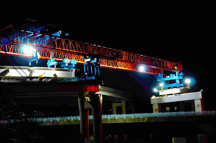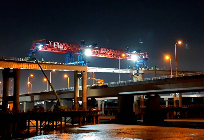 在現(xiàn)場指揮人員指揮下,兩臺架橋機(jī)分別在A、D匝道上同時(shí)架梁,經(jīng)過4個(gè)多小時(shí)的操作,先后完成13道工序操作流程,將4片40米長的疊合梁一次性安全架設(shè)到位,成功上跨金塘大橋。